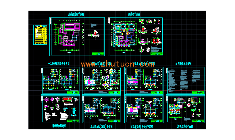 结构加固构造详图(梁、柱、板、基础、墙体),内容包括原基础平面图及改造平面图,新基础平面图,一层框架柱及墙体加固平面图A部分二层墙体加固平面图,结构改造设计说明,墙柱梁加固详图,屋顶层结构改造平面图,梯间屋面(机房顶)层结构改造平面图