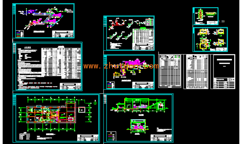 包含设计说明及主要设备材料表,工艺流程图,蓄水池平、剖面图,带式污泥浓缩脱水机基础详图,给排水管道透视图,设备平面布置图,给排水管道平面布置图