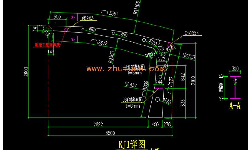 7字形膜结构车棚施工图,膜结构结构型式:骨架式;本工程采用白色膜材,基材采用聚脂纤维基布和聚偏氟乙烯(PVDF)涂层,钢材:本设计图中所有钢构件所用材料为Q235B,钢管采用高频焊管及无缝钢管。