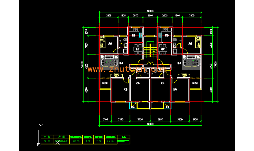 三室二厅二卫多层砌体结构住宅户型CAD图,总建筑面积110.55