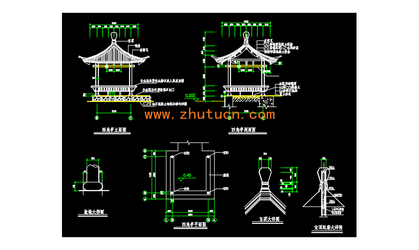 多个亭子cad施工图(圆亭 四角亭 凉亭),四角亭立面图,四角亭剖面图,四角亭平面图,宝顶配筋大样图