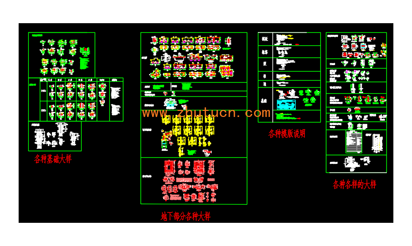 包含桩基础大样及说明,桩承台大样,管桩接桩大样,截水沟大样,电梯井道牛腿大样,基础梁锚固大样,地下室墙柱大样,板的通用构造详图,空调板大样,入口雨披檐沟大样,腰线大样,梁上或墙上起柱构造,吊钩大样,水池剖面大样
