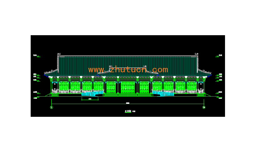 一层歇山仿古游客中心建筑施工图,本工程为现浇钢筋混凝土框架结构,建筑层次为一层歇山式仿古建筑,建筑面积1156.44平方米,建筑高度12.14米。
