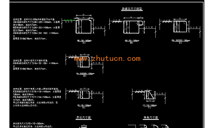 A型路缘石结构尺寸为30×25×100cm,外露高度为18cm,埋深为7cm。