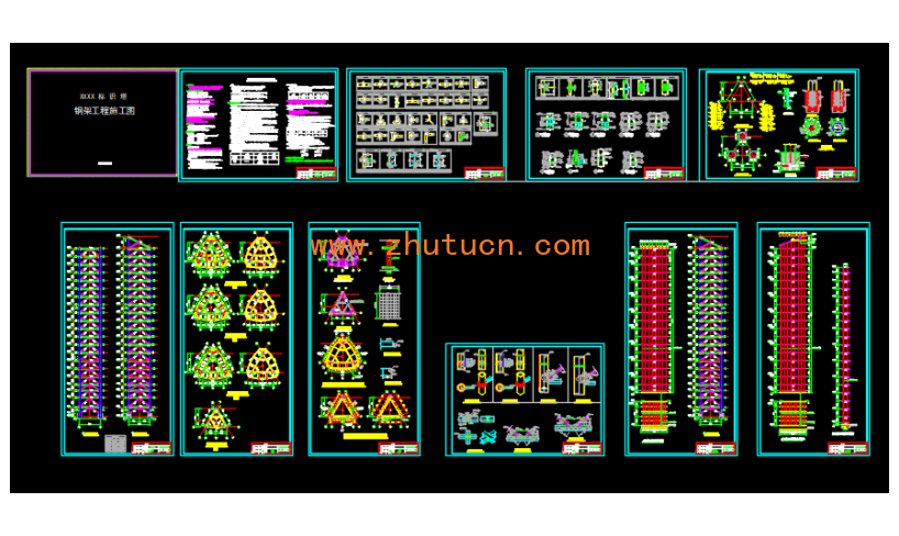 工程为标识塔,高68m,宽约11m,主体采用钢结构,包含钢结构设计总说明,标准焊接大样一,钢结构柱底反力,钢骨架立面图,钢架平面布置图,连接大样,次龙骨架布置图