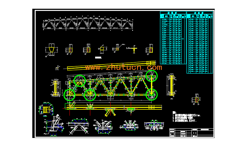 由于厂房长度为72m,跨度L=24m,故在房屋两端第二开间(因第一开间尺寸为5.5m)设置三道上弦横向水平支撑和下弦横向水平支撑,其他屋架只在下弦跨中央设一道柔性系杆,上弦因有檩条可不设系杆,另外在第一开间下弦设三道刚性系杆。每节间放两根檩条在檩条跨中设一道拉条。