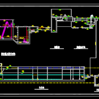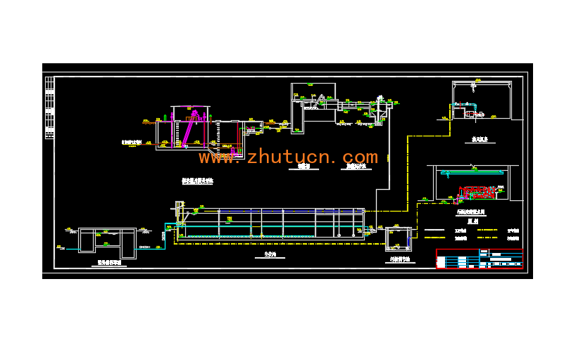 污水处理厂工艺流程图,包含粗格栅及提升泵站,鼓风机房,污泥浓缩脱水剖面图,生化池,紫外线消毒,细格栅及涡流沉砂池施工