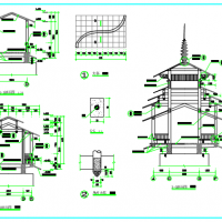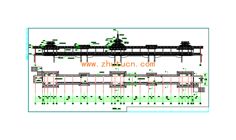 民族风情区风雨桥建筑设计施工图,包含平面图,立面图,剖面图,桥头平台平面图,飞来椅大样,中央楼亭+2.550平面图,中央楼亭飞来椅立面图,天面平面图
