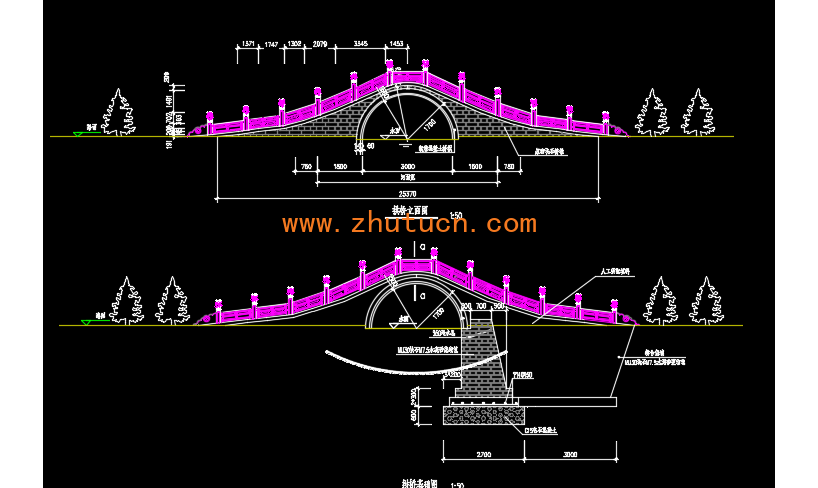 石拱桥设计CAD图(带设计说明),包含拱桥立面图,拱桥基础图,拱桥平面图,青石钩栏结构装配图