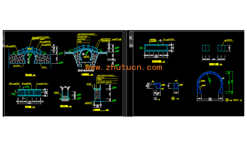 景观石拱桥CAD图,桥立面图,B-B剖面图,桥平面图,桥侧立面图栏杆梁平面图