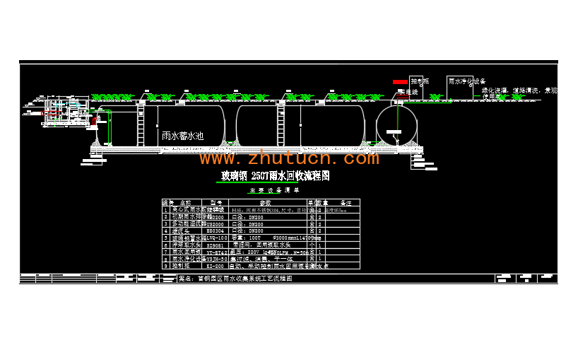 客运中心雨水收集项目设计图纸,设计范围 :本工程设计内容从原水进入水处理构筑物开始,达标回用出水口结束。回收雨水用于绿化、水景、冲洗路面。水池容积为500吨。由于水池大小的限制,回收17%,水池即可收满。当滤水效率为70%时,进水口流量为22L/S,需设置雨水过滤器2个。