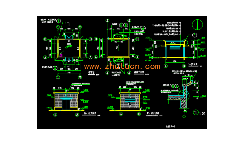 某学校垃圾房及门房建筑设计图,包含建筑设计施工说明,平面图,屋面平面图,南、北立面图,东、西立面图