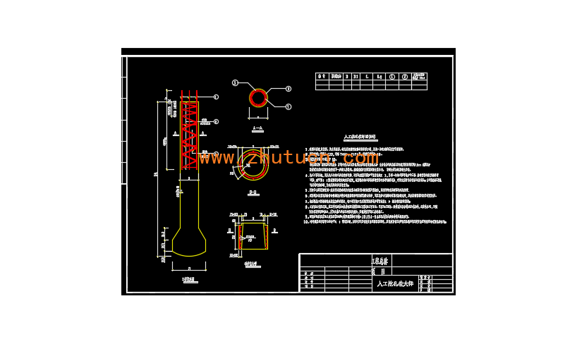 人工挖孔桩大样cad图,桩基成孔后 需清除孔底虚土 并经专业人员确认孔底土层为设计支承土层 当为嵌岩时尚应采用有效方法探明孔底7.5m 范围内Ñ性及无软弱夹层后方能进行下一步的工序操作。挖孔过程中应根据周围土质作砖、 混凝土及钢筋混凝土护壁。