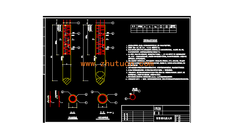 沉管灌注桩CAD大样,桩身施工前须试成孔,数量不少于两个,以便核对地质资料、检验用的设备、施工工艺以及技术要求是否适宜, 如出现缩颈、塌孔、回淤、贯入度不能满足设计要求时,应拟定补救措施或重新考虑施工设备及施工工艺。