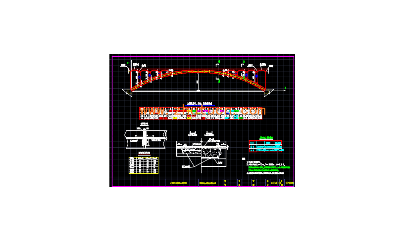 主拱圈为预制腹板、横隔板在拱架上组装,浇筑组装接头、底板和顶板形成的拱箱。净跨径为70米,矢跨比为1/7,拱轴系数为2.514。主拱圈由五个箱形成。拱箱为腹板、横隔板、底板和顶板组合形成五箱室,宽7.6m。腹板和横隔板采用预制组装。