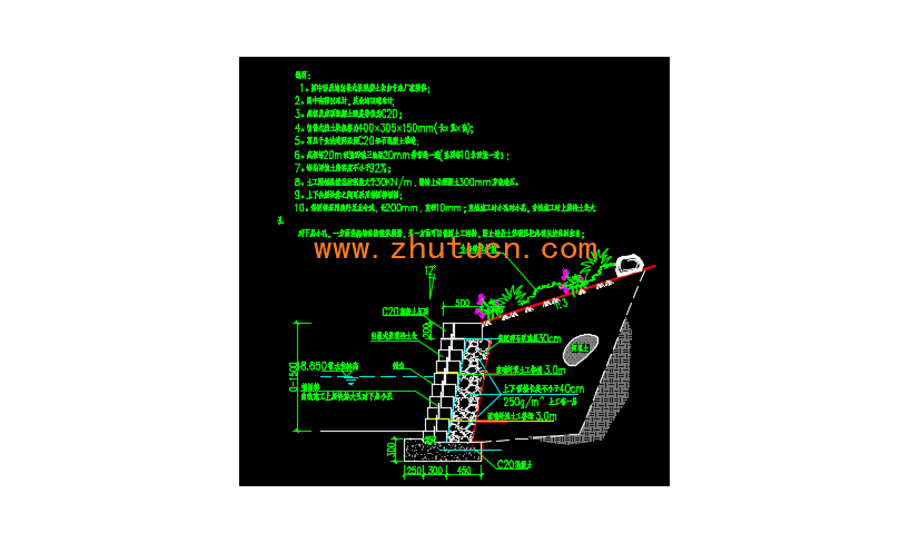 自嵌式景观挡土墙CAD图,底板及盖顶混凝土强度等级为C20;自嵌式挡土块规格为400×305×150mm(长×宽×高);顶层干垒块缝间采用C20细石混凝土灌缝;