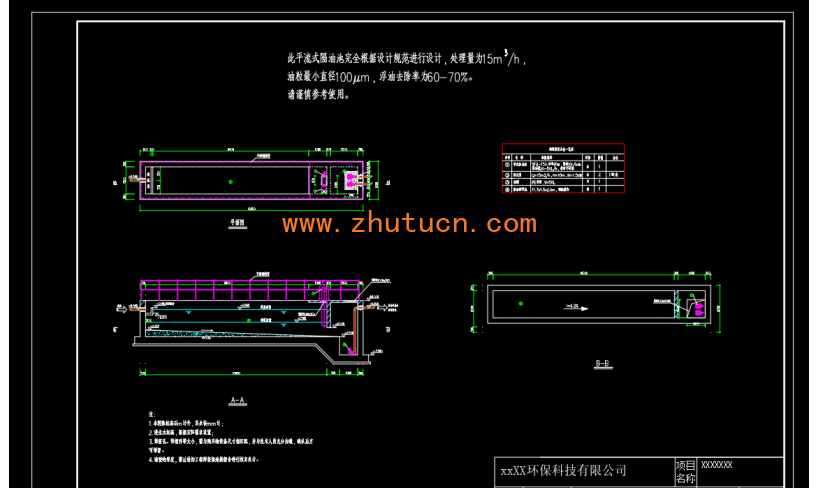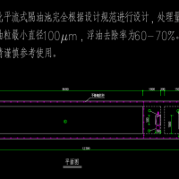 平流式隔油池,设计流量15m3/h。可直接用来施工使用。适用范围:适用油珠粒径100-150μm,去除率60%。水平流速为2-5mm/s。上升流速为0.75m/h。此隔油池使用的是浮油回收机,而不是刮油机。直接将油提升至储油桶内。此隔油池可地上可地下,不占用过多的面积。