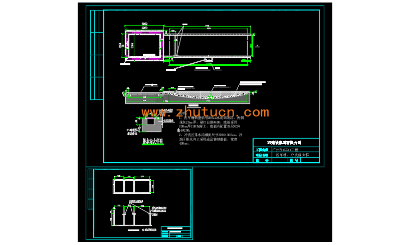 1、洗车槽侧壁采用200mm水泥砖砌筑,两侧抹灰20mm厚,刷红白漆@400,底板采用300mm厚C30混凝土,底板内配置双层双向 14@200;