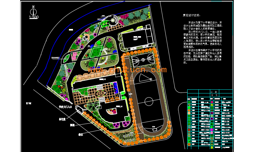 在小学的大门入口,一进入就有棵参天的古木,使小学的景观,既庄重又不失风雅。设计本着园林原则和人性原则,使人在小学内四季都能感受到绿意和生命的气息。使自然与人相息相存。