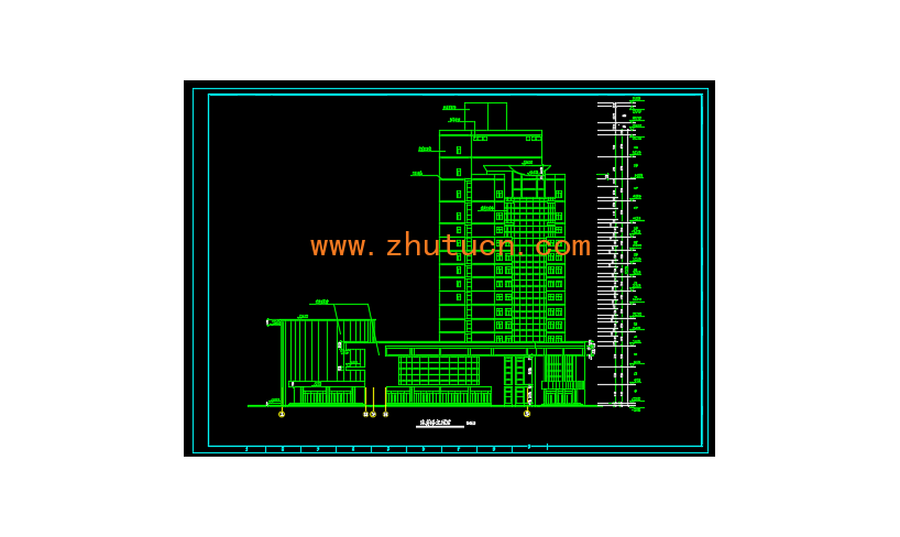 广播电视中心广电中心建筑设计图,本工程位于合川市,是一幢以广播电视为中心兼商贸、餐饮、娱乐、宾馆、办公、地下停车为一体的综合楼。总建筑面积为13326m2.本工程总高65.7m,属一类高层建筑。
