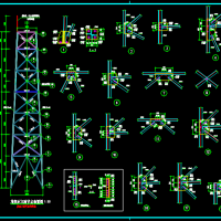十多米高钢结构烟囱塔架结构CAD图,建筑抗震设防类别:标准设防类(丙类)。基础短柱、基础梁抗震等级为四级。包含结构设计说明,基础平面布置图,基础配筋图,角钢塔柱底板,基础短柱大样,塔架正立面示意图,塔架正立面角钢布置图,塔架正立面节点布置图
