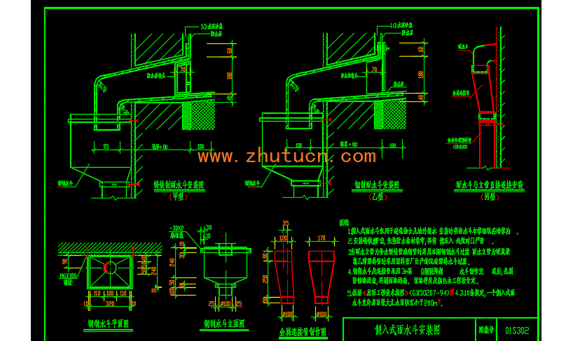 筑图网 01S302各类雨水斗标准CAD图集,包含有压流虹吸式雨水斗外形图,雨水斗总装配图,侧入式雨水斗制造图 铸铁,雨水斗零件图,侧入式雨水斗安装图