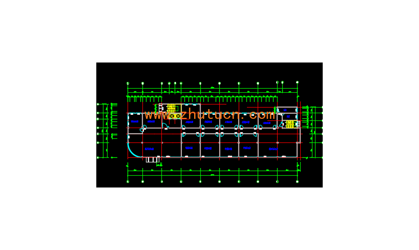(2)本工程为一般的框架结构,该工程为地上八层,局部第五层。建筑平面尺寸为:68.94 m×21.84m。其中1至7层是办公室,第八层为咖啡厅。