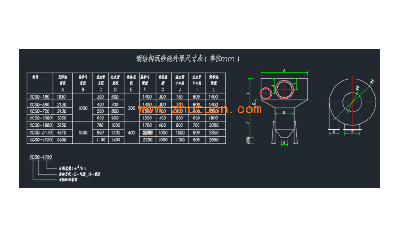 筑图网提供碳钢机械旋流沉砂器CAD图,旋流沉砂器是一种利用机械力控制水流流态与流速的物理沉砂装置,主要用于城镇污水处理及工业废水预处理,属于污水处理的物理沉砂设备 。它一般用于城市生活污水处理厂的初沉池前,细格栅之后,分离污水中的较大无机颗粒。
