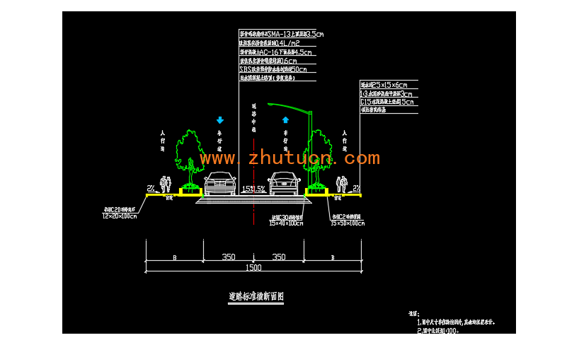 包含工程数量表,区位关系图,道路平面图(一)~(四),道路标准横断面图,人行道结构及路边石大样图,路面及路缘石结构图,水泥混凝土路面接缝构造图,人行道残疾人通道设计图,盲道设计图,管网过街路面补强设计图