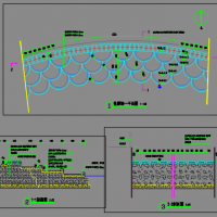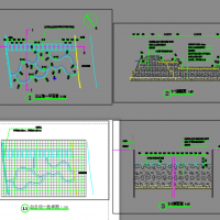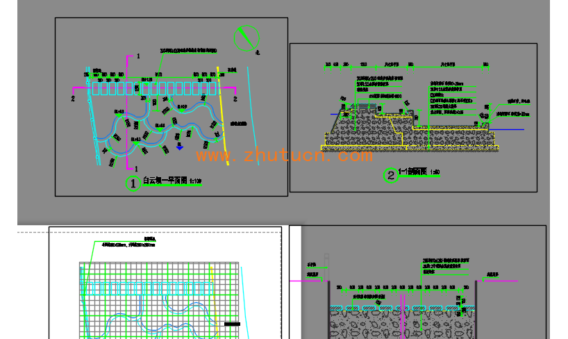 白云坝及鱼鳞坝做法CAD详图,包含鱼鳞坝一平面图,白云坝一平面图,1-1剖面图,2-2剖面图,面层采用200厚600