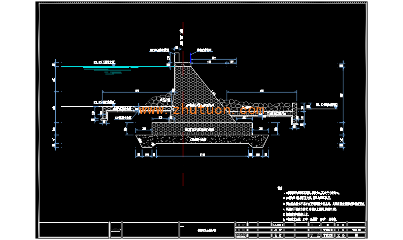 筑图网提供浆砌石重力式拦水坝CAD断面图,大坝为M10浆砌石重力坝,石料为MU60块石;坝地基承载力不足时应采用混凝土桩基础,具体深度应根据地质勘查而定;坝基应开挖成台阶状,略倾向上游面,浇筑C15砼。本坝洪水标准,20年一遇设计,100年一遇校核。