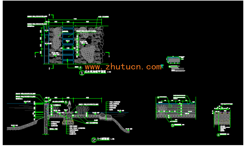 景观拦水坝花岗岩汀步拦水坝CAD图,包含拦水坝局部平面图,铁丝石笼设计图,剖面图,花岗岩汀步拦水坝