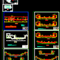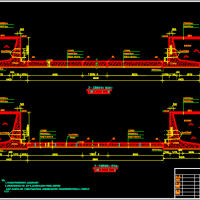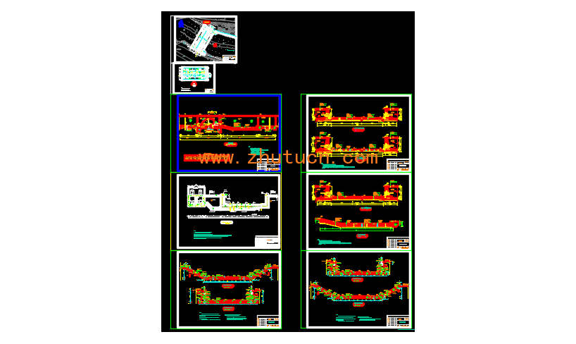 某河道橡胶坝设计CAD施工图,本橡胶坝采用枕式,单跨结构,采用压板锚固。推荐坝袋采用兰色。包含橡胶坝平面图,橡胶坝平面布置图,橡胶坝纵剖面图,橡胶坝横剖面图,铺盖段横断面图,海漫段横断面图,消力池剖面图