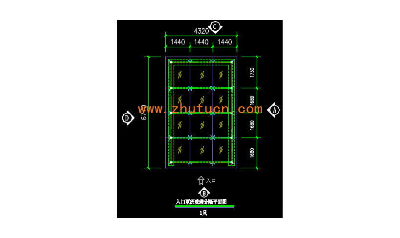 4×6m点支式钢结构玻璃雨棚施工图,包含入口A、D立面图,入口C立面图,入口柱网梁平面布置图,入口顶部玻璃分隔平面图,入口B立面图,钢柱与墙体连接节点,顶部点式幕墙纵剖节点,入口侧立面详细节点