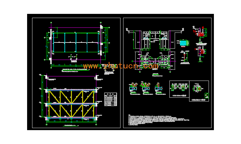 钢结构连廊结构设计CAD施工图,包含钢结构连廊结构平面布置图,钢结构连廊立面布置图(A-A),钢连廊支座大样