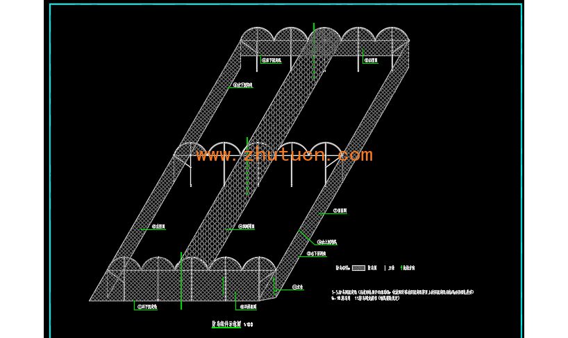 果园防雹网防鸟网工程设计图,本工程为某果园防雹网工程。构筑物结构类型: 轻型钢结构。防雹网:优质聚乙烯材质,网孔10mm×10mm,遮光率<10%,抗UV抗老化。