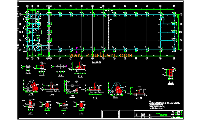 内容包括结构施工图设计说明,桩位平面布置图,基础结构平面图,1-4轴柱平面布置图,墙面檩条布置图,刚架图,楼梯详图