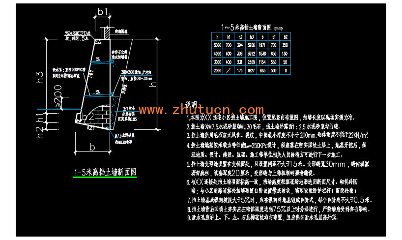 1-5米高石砌挡土墙断面CAD图,挡土墙为M7.5水泥砂浆砌MU30毛石,挡土墙外露面1:2.5水泥砂浆勾凸缝。