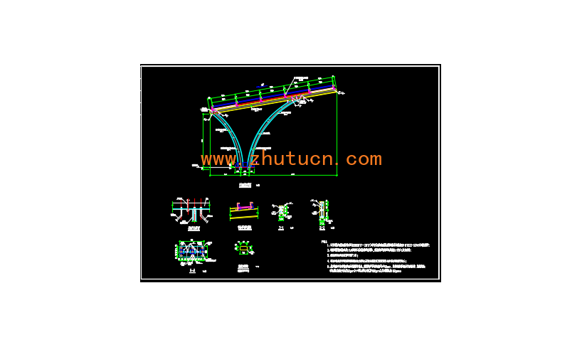 本设计按钢结构设计标准(GB50017-2017)和门式刚架轻型房屋结构技术规范(GB 51022-2015)进行设计;包含光伏车棚组件斜平面布置图,光伏车棚支架斜平面布置图,车棚支架详图,柱脚详图。