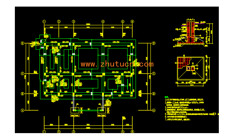 框架结构柱下条形基础办公楼结构施工图,1.±0.0以下彻体采用Mu10砌块,M7.5水泥砂浆砌筑,墙厚200。2.基坑挖至-2.3m时,地基承载力设计值fa=160KPa,当不符合设计要求时,应会同设计人员另行商定处理。