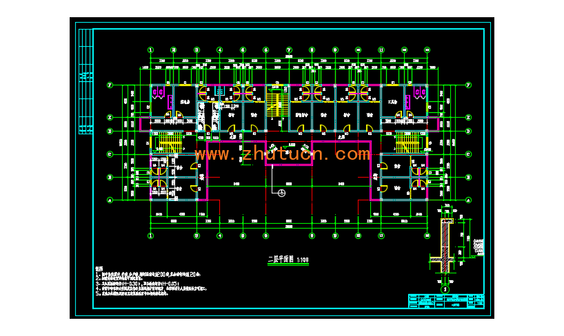 在实际工程中,钢筋混凝土框架结构是一种较为普遍结构形式,广泛应用于住宅、办公、学校等公共建筑。本设计主要对多层框架宿舍楼的横、竖向框架进行了设计。在进行设计时首先查《荷载规范》对结构的恒载、活载以及风荷载进行计算。竖向荷载利用迭代法、水平荷载利用D值法进而得到各种作用下结构各杆件的内力标准值。然后按照最不利组合方式,对各种作用下的内力进行组合。最后在组合中找出各杆件最不利的一组或几组对构件进行截面设计,选取最安全的结果进行配筋并绘出施工图。本设计还对基础、楼板、楼梯等进行了设计,并绘出了结构施工图。除对本框架进行手算外,还利用了PKPM对本结构进行了电算。